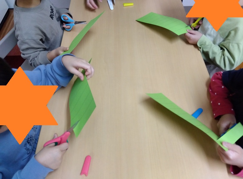 年長さんは、まずハサミを使用して直線切りで細長く画用紙を切ります。