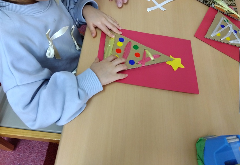 その後半分に折って糊で端同士をくっつけて、さらに台紙にツリーの形になるように配置してつけていきます💪